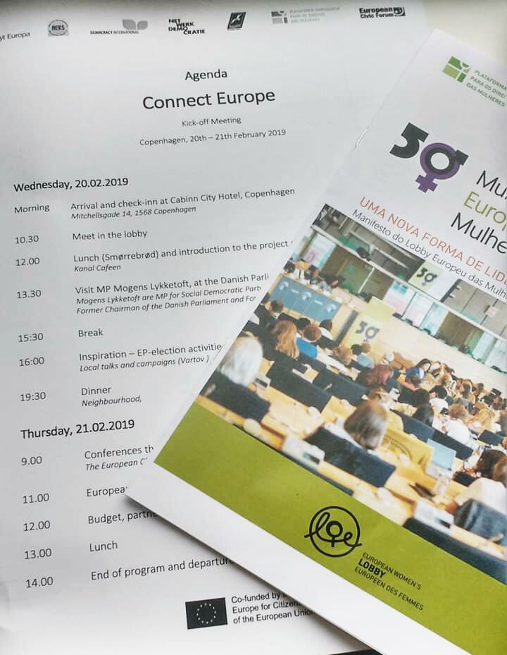 O projecto “Connect Europe” visa envolver as cidadãs e cidadãos de 7 países europeus num diálogo construtivo sobre o futuro da Europa e apoiar as várias agendas e valores da UE. O projecto é co-financiado pelo Programa Europa para os Cidadãos da União Europeia e concebido para aumentar a cooperação transnacional na UE. Tal será realizado através de palestras locais, conferências nacionais, campanhas pan-europeias e um evento final. O projeto é liderado por Nyt Europa da Dinamarca com os esforços conjuntos da Aktiivinen Eurooppalainen Kansalainen Suomi Ry – AEKS (Finlândia), Democracy International eV (Alemanha), Stichting Netwerk Democratie (Holanda), Stowarzyszenie Gmin RP Euroregion Baltyk (Polônia), Plataforma Portuguesa para os direitos das mulheres (Portugal) e o Fórum Cívico Europeu.