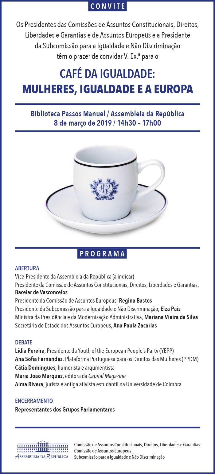 As Comissões Parlamentares de Assuntos Constitucionais, Direitos, Liberdades e Garantias, de Assuntos Europeus e a Subcomissão para a Igualdade e Não Discriminação organizam no próximo dia 8 de março na Biblioteca da Assembleia da República, o Café da Igualdade, este ano alusivo ao tema “Mulheres, Igualdade e a Europa”. Ana Sofia Fernandes, estará presente em representação da PpDM.