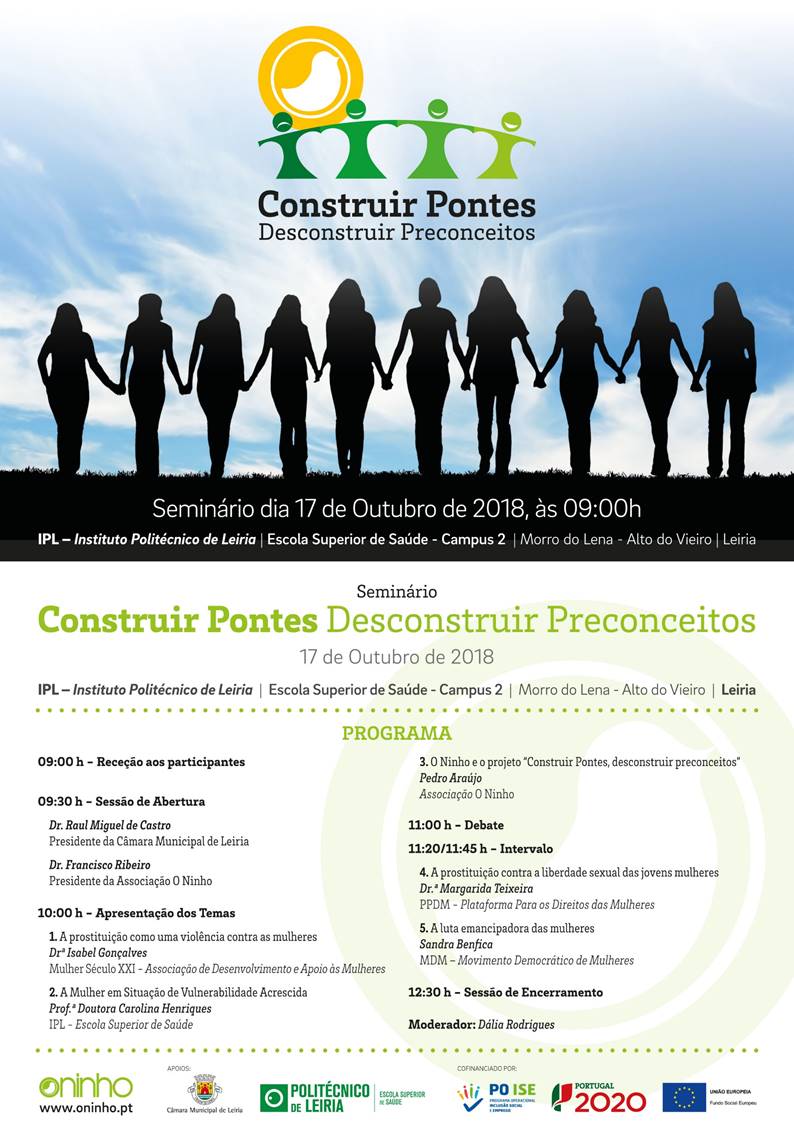 A Associação O Ninho, a Câmara Municipal de Leiria e o IPL – Instituto Politécnico de Leiria convidam para o Seminário “Construir Pontes, Desconstruir Preconceitos”, sobre Prostituição – do Mito à Realidade. A Plataforma Portuguesa para os Direitos das Mulheres estará representada pela Margarida Teixeira.