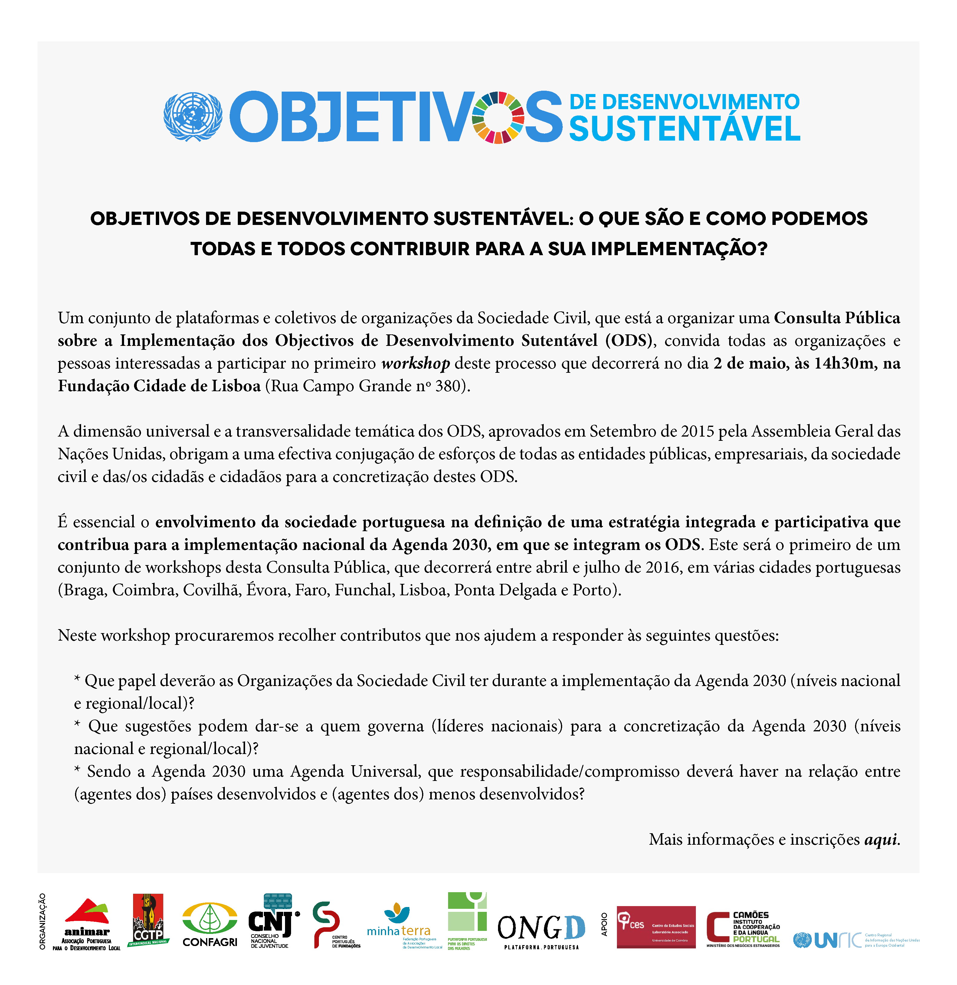 Um conjunto de plataformas e coletivos de organizações da Sociedade Civil, incluindo a Plataforma Portuguesa para os Direitos das Mulheres, está a organizar uma consulta pública sobre a implementação dos ODS, e vem convidar todas as organizações e pessoas interessadas a participar no primeiro workshop no dia 2 de maio, às 14h30m, na Fundação Cidade de Lisboa (Rua Campo Grande, n.º 380).