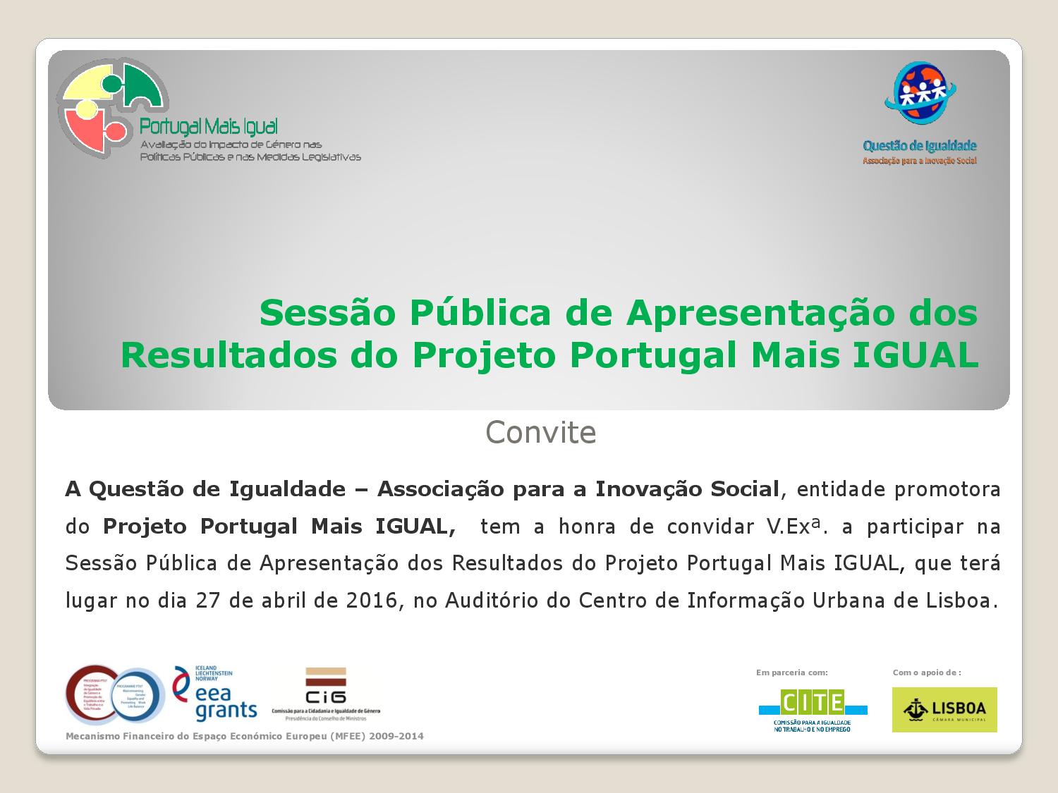 A Questão de Igualdade – Associação para a Inovação Social, entidade promotora do Projeto “Portugal Mais IGUAL”, promovido no âmbito do Programa “PT07 – A Integração da Igualdade de Género e a Promoção do Equilíbrio entre o Trabalho e a Vida Privada”, financiado pelo EEA GRANTS e gerido pela Comissão para a Cidadania e Igualdade de Género – CIG, convida a participar na Sessão Pública de apresentação dos resultados do projeto, no dia 27 de Abril, às 9h30m, no Auditório do Centro de Informação Urbana de Lisboa.